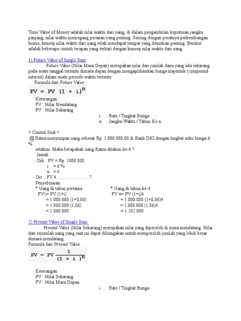 Dengan menggunakan rumus terakhir, berikut penjelasan lebih lanjut tentang nilai waktu uang dengan mempelajari pengaruh bunga bank dan inflasi terhadap nilai uang. Time value of money dipengaruhi oleh opportunity cost (nilai kesempatan) dan inflation factor (faktor inflasi). Berapauang seseorang pada akhir tahun 1,2 s/d 10?jawab:1. Investasi yang dilakukan saat ini tidak serta merta menghasilkan peningkatan pendapatan hari ini juga. Diagram waktu pembayaran adalah sebagai berikut: Perusahaan harus menghitung arus kas dengan bunga tertentu dan membandingkannya dengan cash flow tanpa bunga. Contoh soal nilai waktu uang. Nilai satu lembar uang lima ribu rupiah setara dengan 4 lembar uang seribu rupiah dan. 24072020 contoh soal pilihan ganda dan jawaban manajemen keuangan. Tujuan pembelajaran 4 adapun tujuan pembelajaran pada sub kompetensi ini adalah : Simulasi soal nilai waktu uang / future value. Annuity adalah sejumlah aliran kas yang besarnya sama setiap tahun. Seseorang yang memiliki uang rp.